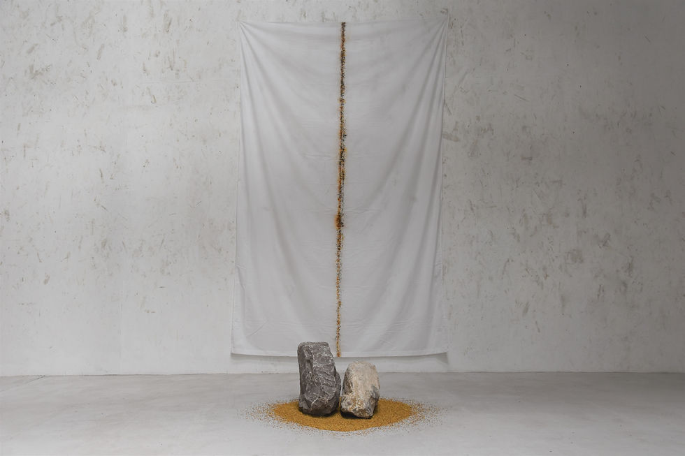 barochores, clitochores, anémochores : toutes les disséminations, 21.III.2021, poudre de lave basaltique, argile rouge et poudre de curcuma sur drap en coton (tissage serré, 57 fils/cm2 : Vision du côté de la nuit), 290 x 180 cm + deux pierres d’enrochement du Boulonnais (calcaire gris du Viséen ou Carbonifère inférieur), environ 45 x 40 x 26 cm et 50 x 26 x 15 cm + pollen de saule fruitier en pelotes (prairie fleurie du parc naturel de la Strandja en Bulgarie : ImkerPur), 2 kg